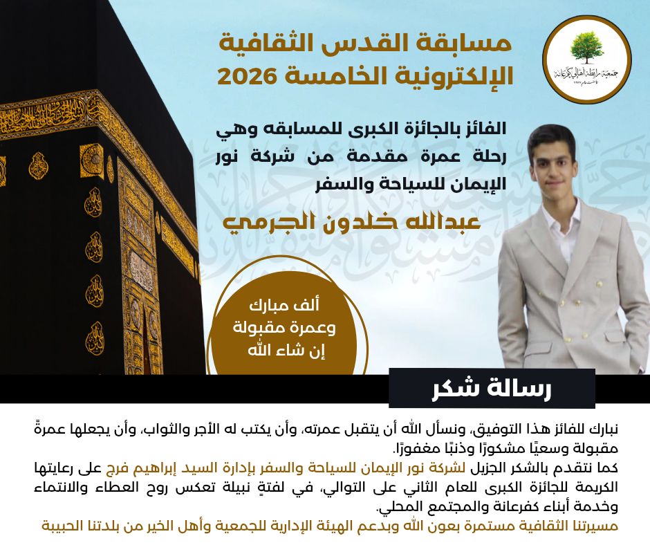 كما نتقدم بالشكر الجزيل لشركة نور الإيمان للسياحة والسفر بإدارة السيد إبراهيم فرج على رعايتها الكريمة للجائزة الكبرى للعام الثاني على التوالي، في لفتةٍ نبيلة تعكس روح العطاء والانتماء وخدمة أبناء كفرعانة والمجتمع المحلي.مسيرتنا الثقافية مستمرة بعون الله وبدعم الهيئة الإدارية للجمعية وأهل الخير من بلدتنا الحبيبة.